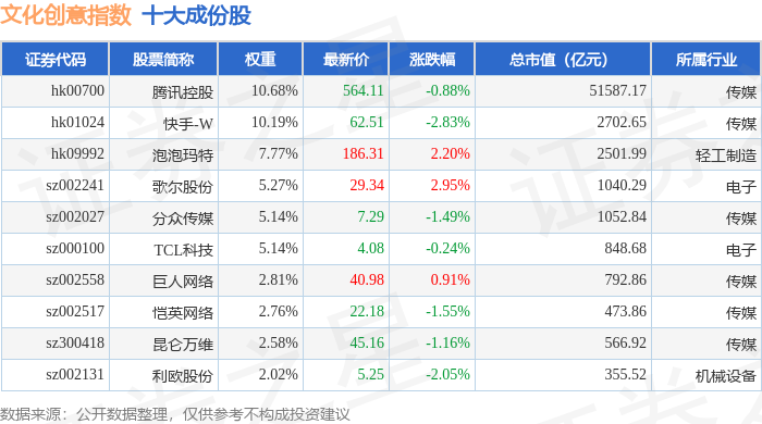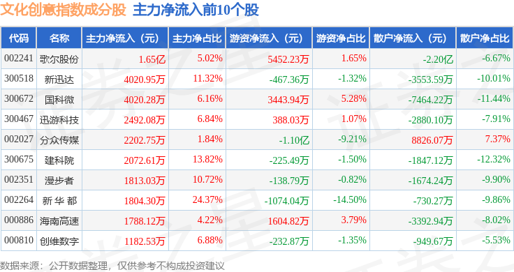 资金流向方面,文化创意(980046)指数成份股当日主力资金净流出合计39.2亿元,游资资金净流入合计4.1亿元,散户资金净流入合计35.11亿元。成份股资金流向详情见下表: