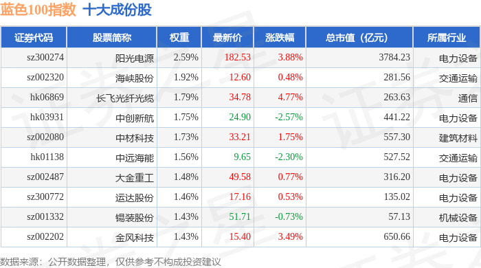 证券之星消息,11月26日,蓝色100(980068)指数报收于3507.21点,跌0.63%,成交427.02亿元,换手率1.07%。当日该指数成份股中,上涨的有36家,中环海陆以19.99%的涨幅领涨,下跌的有57家,江龙船艇以12.43%的跌幅领跌。