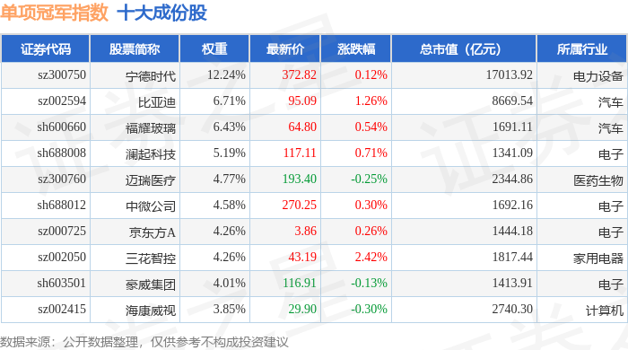 单项冠军(980150)指数十大成份股详情如下: