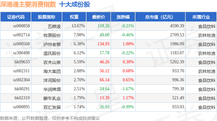 深港通主要消费(983021)指数十大成份股详情如下: