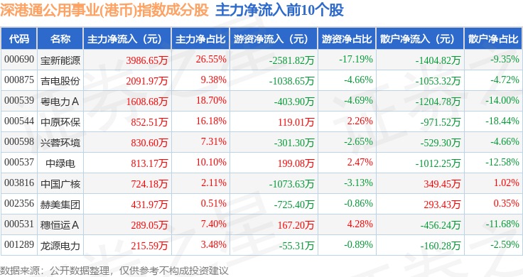 资金流向方面,深港通公用事业(港币)(983032)指数成份股当日主力资金净流出合计7118.31万元,游资资金净流入合计3826.64万元,散户资金净流入合计3291.67万元。成份股资金流向详情见下表: