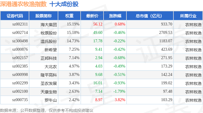深港通农牧渔(983051)指数十大成份股详情如下: