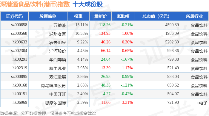 深港通食品饮料(港币)(983066)指数十大成份股详情如下: