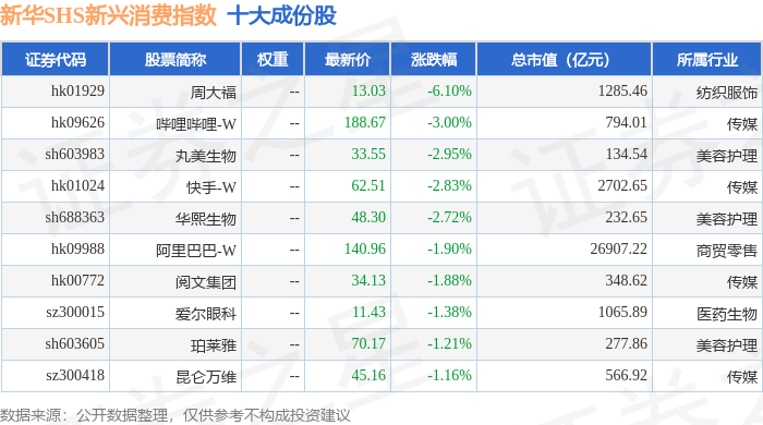 新华SHS新兴消费(989006)指数十大成份股详情如下: