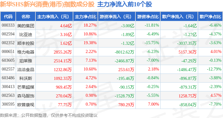 资金流向方面,新华SHS新兴消费(港币)(989007)指数成份股当日主力资金净流出合计4.08亿元,游资资金净流出合计4.31亿元,散户资金净流入合计8.39亿元。成份股资金流向详情见下表: