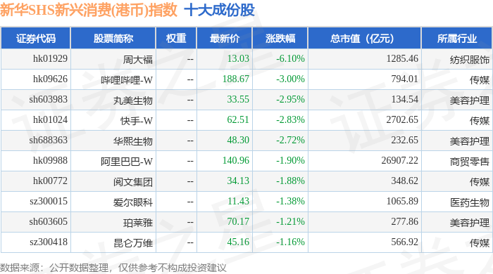 新华SHS新兴消费(港币)(989007)指数十大成份股详情如下: