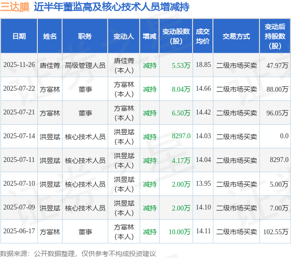 三达膜近半年内的董监高及核心技术人员增减持详情如下: