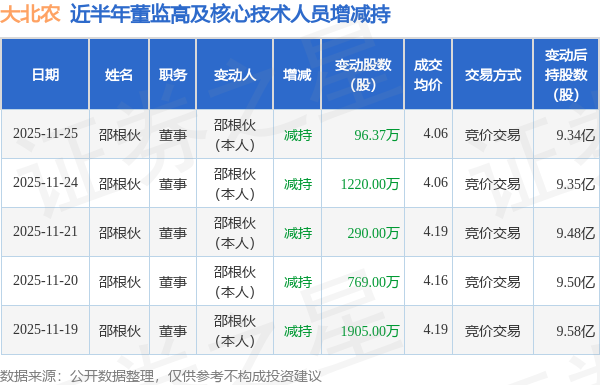 证券之星消息,根据11月26日市场公开信息、上市公司公告及交易所披露数据整理,大北农(002385)最新董监高及相关人员股份变动情况:2025年11月25日公司董事邵根伙共减持公司股份96.37万股,占公司总股本为0.0224%。变动期间公司股价下跌0.25%,11月25日当日收盘报4.05元。
