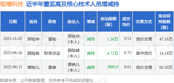 银禧科技近半年内的董监高及核心技术人员增减持详情如下: