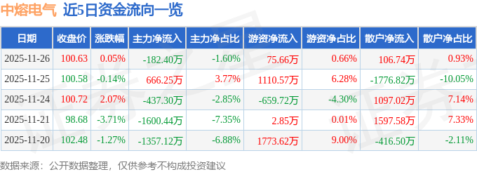 证券之星消息,截至2025年11月26日收盘,中熔电气(301031)报收于100.63元,上涨0.05%,换手率1.65%,成交量1.13万手,成交额1.14亿元。