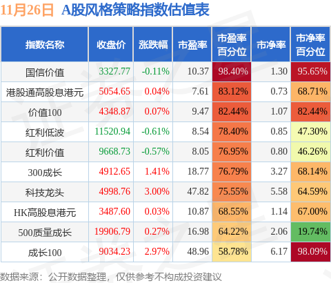 风格策略指数方面,国信价值的市盈率百分位较高,为98.4%。而成长100的市盈率百分位较低,为58.78%。