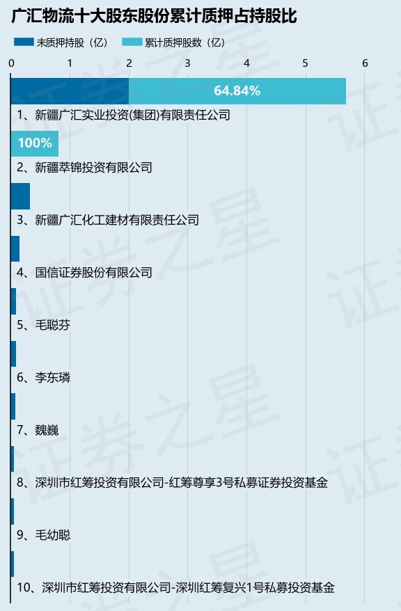 截止本公告日,股东新疆广汇实业投资(集团)有限责任公司已累计质押股份3.69亿股,占其持股总数的64.84%,股东新疆萃锦投资有限公司已累计质押股份8154.53万股,占其持股总数的100.0%。本次质押后广汇物流十大股东的累计质押股份占持股比例(占持股比例的计算以公司最新一期财务报表公布的十大股东的持股总数为基准)见下图:
