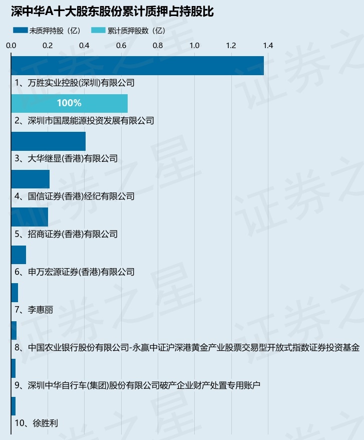 截止本公告日,股东深圳市国晟能源投资发展有限公司已累计质押股份6350.87万股,占其持股总数的100.0%。本次质押后深中华A十大股东的累计质押股份占持股比例(占持股比例的计算以公司最新一期财务报表公布的十大股东的持股总数为基准)见下图: