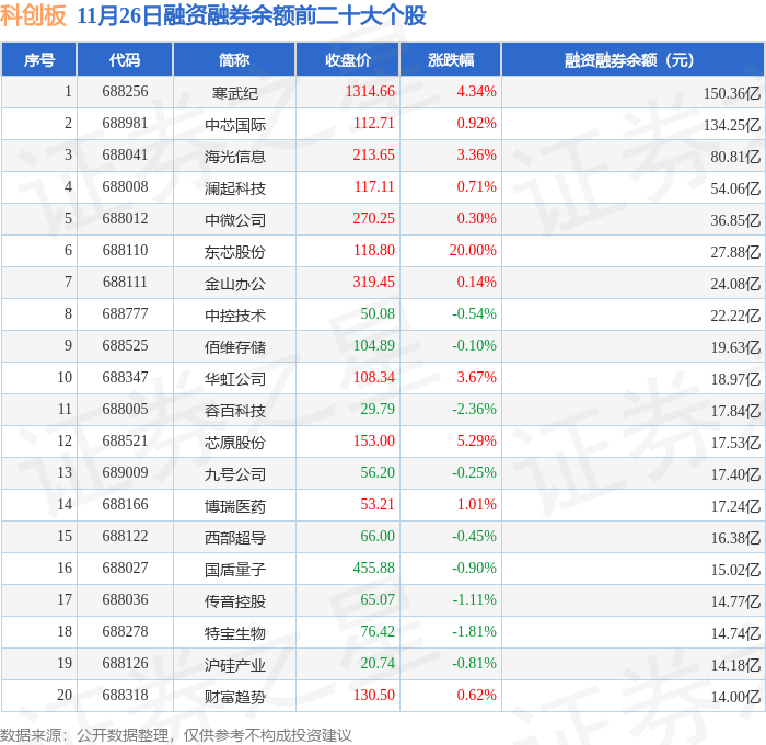 科创板融资融券余额前三分别为:寒武纪(688256)融资融券余额150.36亿元、中芯国际(688981)融资融券余额134.25亿元、海光信息(688041)融资融券余额80.81亿元,前20具体见下表: