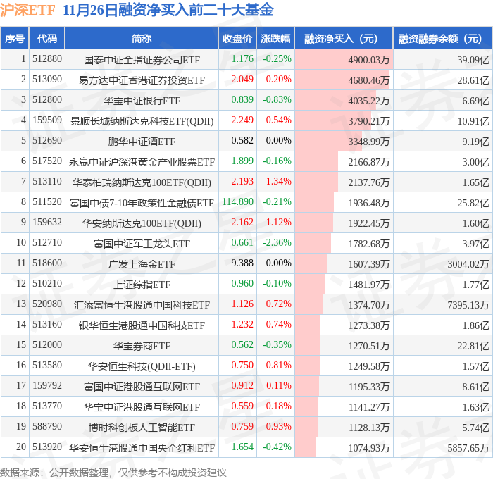 沪深ETF融资净买入前三分别为:国泰中证全指证券公司ETF(512880)融资净买入4900.03万元、易方达中证香港证券投资ETF(513090)融资净买入4680.46万元、华宝中证银行ETF(512800)融资净买入4035.22万元,前20具体见下表: