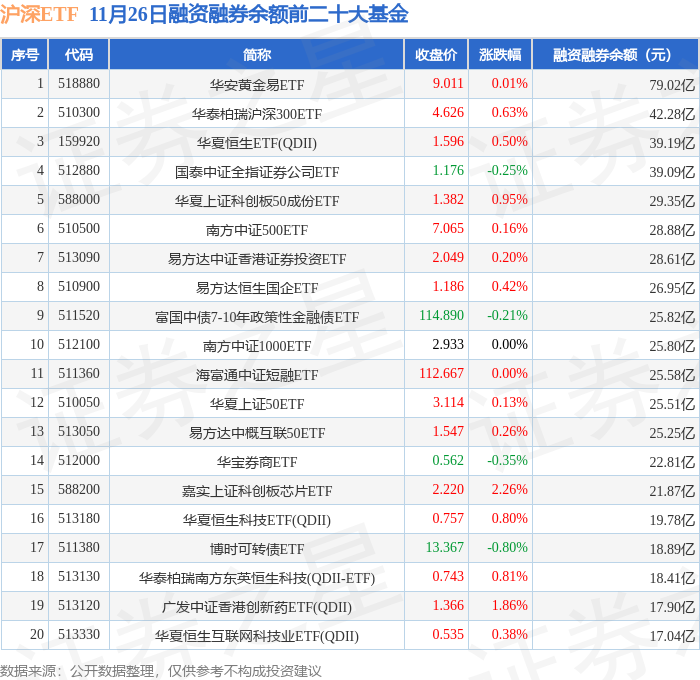 沪深ETF融资融券余额前三分别为:华安黄金易ETF(518880)融资融券余额79.02亿元、华泰柏瑞沪深300ETF(510300)融资融券余额42.28亿元、华夏恒生ETF(QDII)(159920)融资融券余额39.19亿元,前20具体见下表: