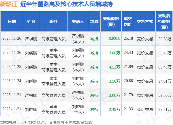新赣江近半年内的董监高及核心技术人员增减持详情如下: