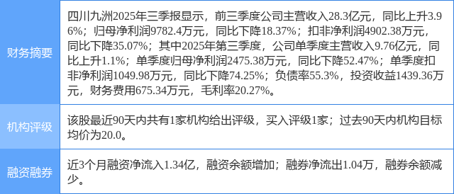 2025年9月25日,中航证券研究员梁晨,张超,闫政圆发布了对四川九洲的研报《2025年中报点评:军民空管装备领军企业,积极布局低空经济新赛道》,该研报对四川九洲给出“买入”评级,认为其目标价为20.0元,现价距离目标价尚有22.17%的涨幅空间。研报中预计公司2025-2027年的营业收入分别为43.92亿、54.73亿元和61.18亿元,归母净利润分别为2.21亿元、3.04亿元和3.68亿元,EPS分别为0.22元、0.30元和0.36元,我们给予“买入”评级,目标价20.00元。证券之星数据中心根据近三年发布的研报数据计算,该研报作者对此股的盈利预测准确度为44.44%。
