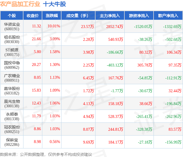 个股表现方面,农产品加工行业当日领涨股为华资实业(600191),该股当日报收11.32,上涨10.01%,成交量23.57万,主力资金净流入2852.74万元。祖名股份(003030)以上涨3.09%紧随其后,该股当日成交量2.28万,主力资金净流入540.93万元。除此之外,ST朗源(300175)、国投中鲁(600962)、广农糖业(000911)均进入当日牛股之列。具体个股列表见下表: