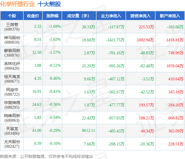 个股表现方面,化学纤维行业当日领跌股为三房巷(600370),该股当日报收2.32,下跌1.69%,成交量30.33万,主力资金净流出117.87万元。神马股份(600810)以下跌1.62%紧随其后,该股当日成交量18.6万,主力资金净流出2421.75万元。除此之外,蒙泰高新(300876)、吉林化纤(000420)、恒天海龙(000677)均进入当日熊股之列。具体个股列表见下表: