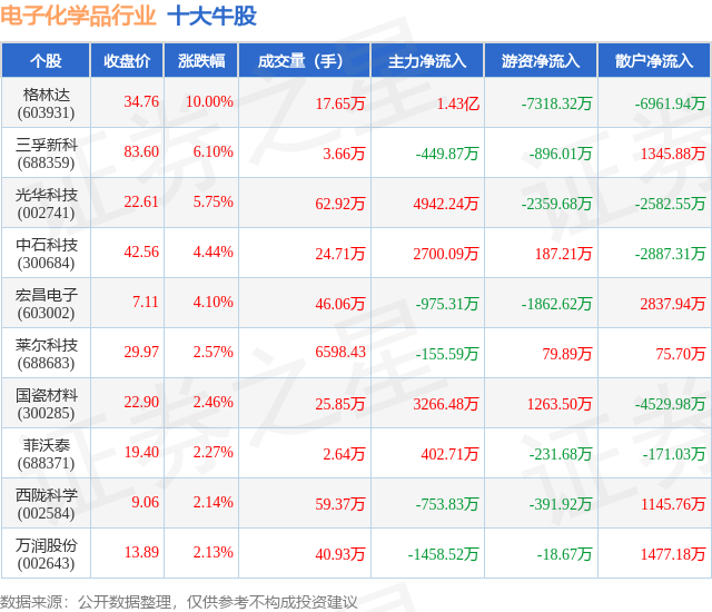 个股表现方面,电子化学品行业当日领涨股为格林达(603931),该股当日报收34.76,上涨10.0%,成交量17.65万,主力资金净流入1.43亿元。三孚新科(688359)以上涨6.1%紧随其后,该股当日成交量3.66万,主力资金净流出449.87万元。除此之外,光华科技(002741)、中石科技(300684)、宏昌电子(603002)均进入当日牛股之列。具体个股列表见下表: