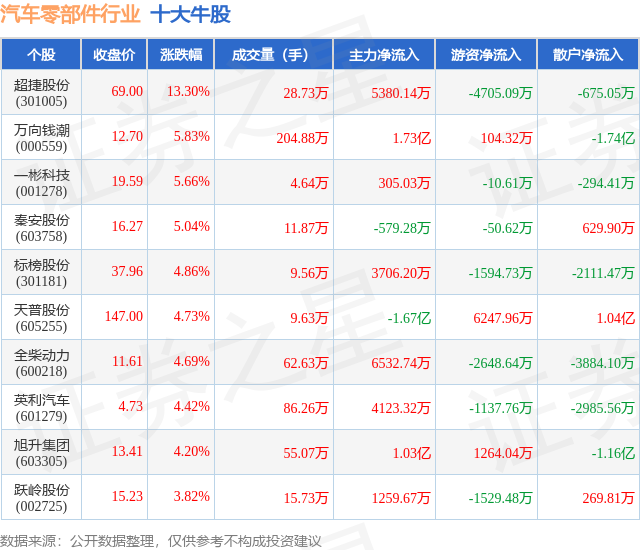 个股表现方面,汽车零部件行业当日领涨股为超捷股份(301005),该股当日报收69.0,上涨13.3%,成交量28.73万,主力资金净流入5380.14万元。万向钱潮(000559)以上涨5.83%紧随其后,该股当日成交量204.88万,主力资金净流入1.73亿元。除此之外,一彬科技(001278)、秦安股份(603758)、标榜股份(301181)均进入当日牛股之列。具体个股列表见下表: