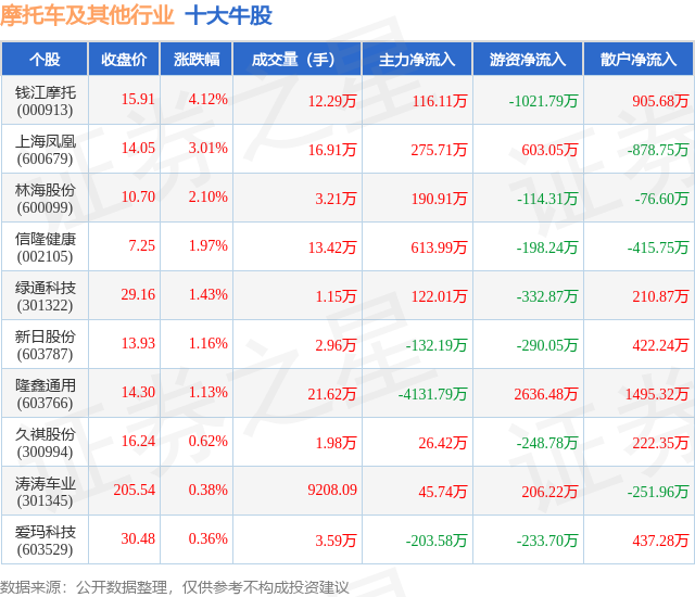 个股表现方面,摩托车及其他行业当日领涨股为钱江摩托(000913),该股当日报收15.91,上涨4.12%,成交量12.29万,主力资金净流入116.11万元。上海凤凰(600679)以上涨3.01%紧随其后,该股当日成交量16.91万,主力资金净流入275.71万元。除此之外,林海股份(600099)、信隆健康(002105)、绿通科技(301322)均进入当日牛股之列。具体个股列表见下表: