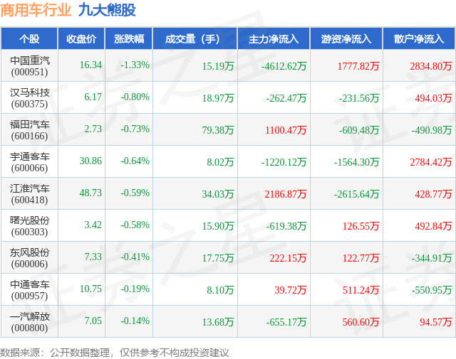 个股表现方面,商用车行业当日领跌股为中国重汽(000951),该股当日报收16.34,下跌1.33%,成交量15.19万,主力资金净流出4612.62万元。汉马科技(600375)以下跌0.8%紧随其后,该股当日成交量18.97万,主力资金净流出262.47万元。除此之外,福田汽车(600166)、宇通客车(600066)、江淮汽车(600418)均进入当日熊股之列。具体个股列表见下表: