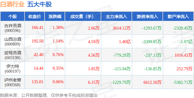 个股表现方面,白酒行业当日领涨股为古井贡酒(000596),该股当日报收166.41,上涨1.38%,成交量2.66万,主力资金净流入3614.12万元。山西汾酒(600809)以上涨1.14%紧随其后,该股当日成交量4.59万,主力资金净流入1.4亿元。除此之外,迎驾贡酒(603198)、伊力特(600197)、泸州老窖(000568)均进入当日牛股之列。具体个股列表见下表: