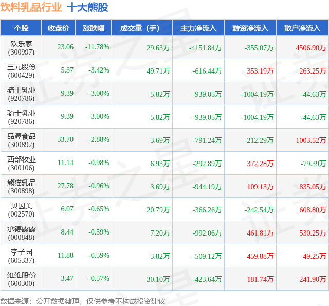 个股表现方面,饮料乳品行业当日领跌股为欢乐家(300997),该股当日报收23.06,下跌11.78%,成交量29.63万,主力资金净流出4151.84万元。三元股份(600429)以下跌3.42%紧随其后,该股当日成交量49.71万,主力资金净流出616.44万元。除此之外,骑士乳业(920786)、骑士乳业(920786)、品渥食品(300892)均进入当日熊股之列。具体个股列表见下表: