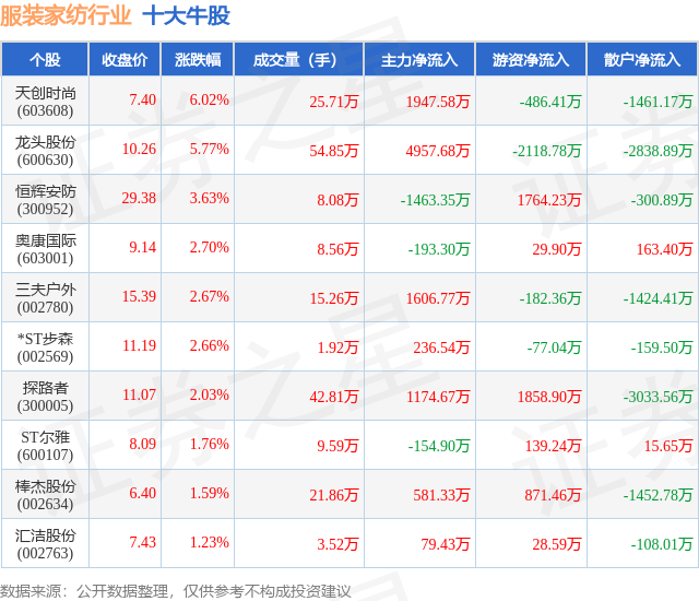 个股表现方面,服装家纺行业当日领涨股为天创时尚(603608),该股当日报收7.4,上涨6.02%,成交量25.71万,主力资金净流入1947.58万元。龙头股份(600630)以上涨5.77%紧随其后,该股当日成交量54.85万,主力资金净流入4957.68万元。除此之外,恒辉安防(300952)、奥康国际(603001)、三夫户外(002780)均进入当日牛股之列。具体个股列表见下表: