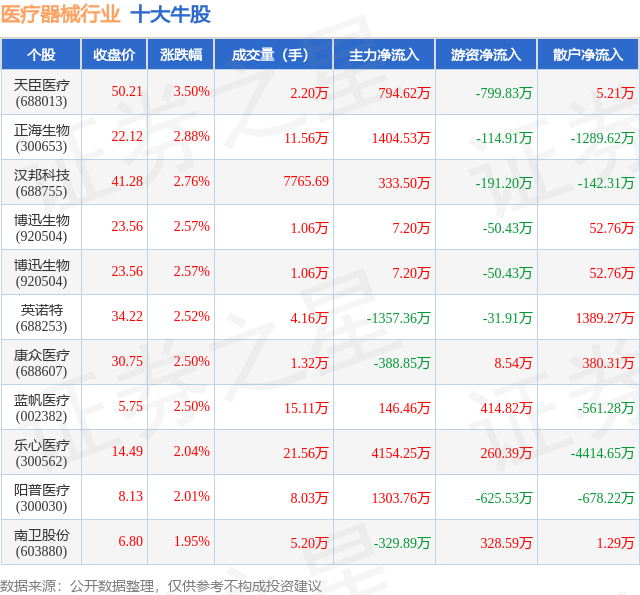 个股表现方面,医疗器械行业当日领涨股为天臣医疗(688013),该股当日报收50.21,上涨3.5%,成交量2.2万,主力资金净流入794.62万元。正海生物(300653)以上涨2.88%紧随其后,该股当日成交量11.56万,主力资金净流入1404.53万元。除此之外,汉邦科技(688755)、博迅生物(920504)、博迅生物(920504)均进入当日牛股之列。具体个股列表见下表: