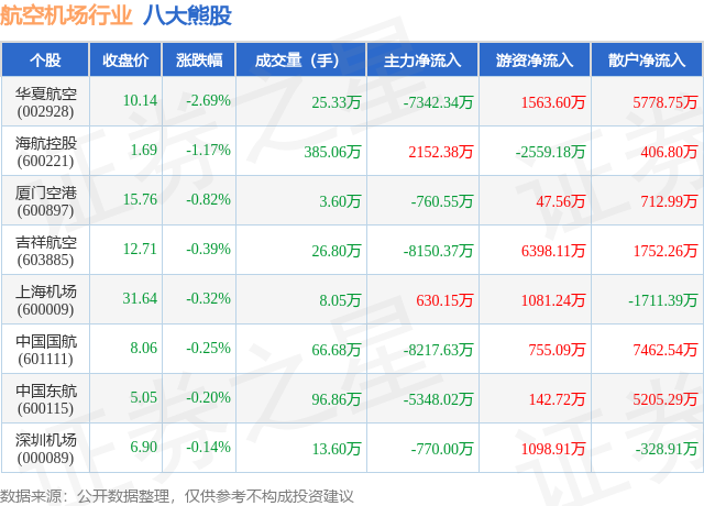 个股表现方面,航空机场行业当日领跌股为华夏航空(002928),该股当日报收10.14,下跌2.69%,成交量25.33万,主力资金净流出7342.34万元。海航控股(600221)以下跌1.17%紧随其后,该股当日成交量385.06万,主力资金净流入2152.38万元。除此之外,厦门空港(600897)、吉祥航空(603885)、上海机场(600009)均进入当日熊股之列。具体个股列表见下表: