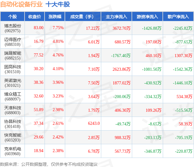 个股表现方面,自动化设备行业当日领涨股为博杰股份(002975),该股当日报收83.0,上涨7.75%,成交量17.22万,主力资金净流入3672.7万元。迈得医疗(688310)以上涨4.81%紧随其后,该股当日成交量6.01万,主力资金净流入680.57万元。除此之外,瑞晟智能(688215)、固高科技(301510)、英诺激光(301021)均进入当日牛股之列。具体个股列表见下表: