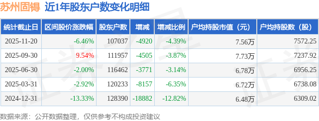 从股价来看,2025年9月30日至2025年11月20日,苏州固锝区间跌幅为6.46%,在此期间股东户数减少4920.0户,减幅为4.39%。