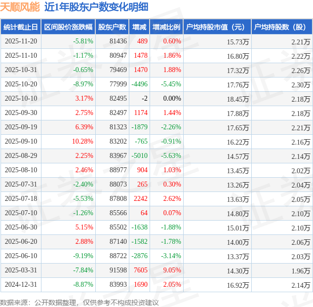 从股价来看,2025年11月10日至2025年11月20日,天顺风能区间跌幅为5.81%,在此期间股东户数增加489.0户,增幅为0.6%。