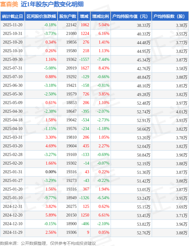 从股价来看,2025年10月31日至2025年11月20日,富森美区间跌幅为0.18%,在此期间股东户数增加1062.0户,增幅为5.04%。