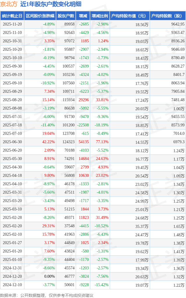 从股价来看,2025年11月10日至2025年11月20日,京北方区间跌幅为4.89%,在此期间股东户数减少2685.0户,减幅为2.9%。