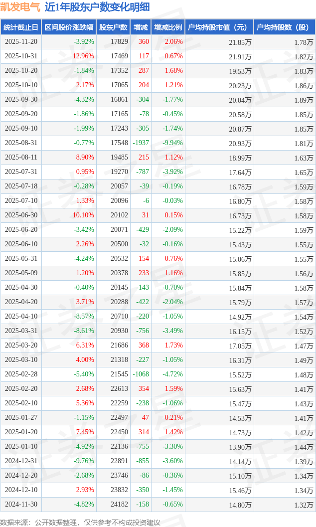 从股价来看,2025年11月10日至2025年11月20日,凯发电气区间跌幅为3.92%,在此期间股东户数增加360.0户,增幅为2.06%。