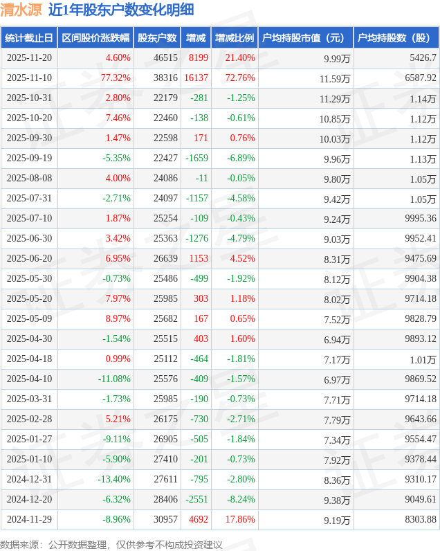 从股价来看,2025年11月10日至2025年11月20日,清水源区间涨幅为4.6%,在此期间股东户数增加8199.0户,增幅为21.4%。
