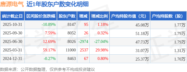 从股价来看,2025年9月30日至2025年10月31日,唐源电气区间跌幅为10.89%,在此期间股东户数增加95.0户,增幅为1.18%。