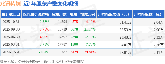 证券之星消息,近日兆讯传媒披露,截至2025年10月31日公司股东户数为1.43万户,较9月30日增加575.0户,增幅为4.19%。户均持股数量由上期的2.96万股减少至2.84万股,户均持股市值为31.41万元。