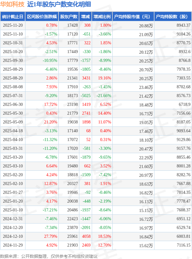 从股价来看,2025年11月10日至2025年11月20日,华如科技区间涨幅为0.78%,在此期间股东户数增加308.0户,增幅为1.8%。