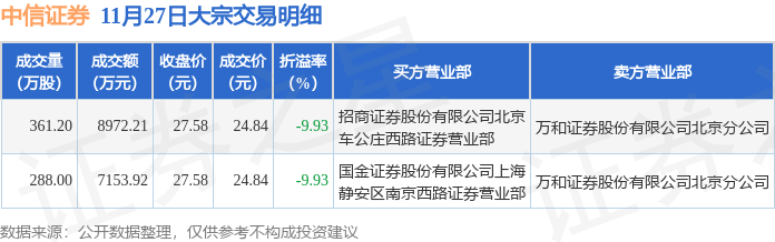 证券之星消息,11月27日中信证券发生大宗交易,交易数据如下: