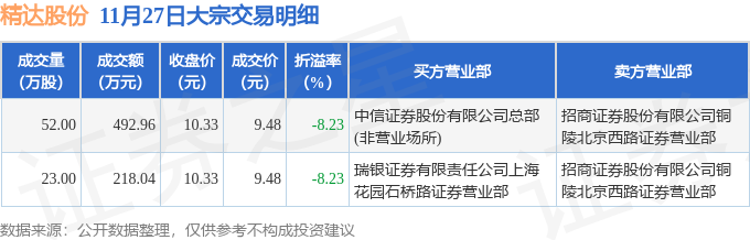 证券之星消息,11月27日精达股份发生大宗交易,交易数据如下: