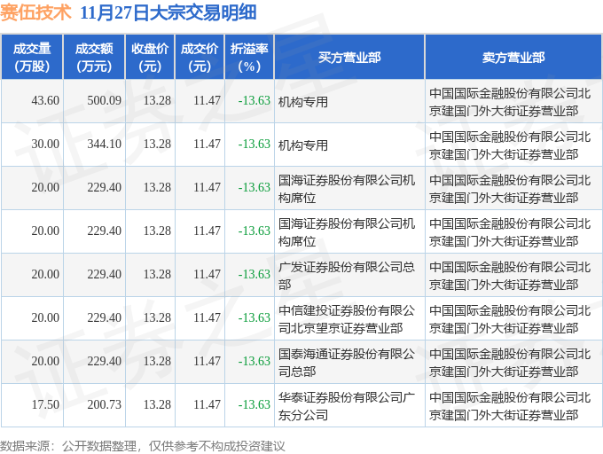 证券之星消息,11月27日赛伍技术发生大宗交易,交易数据如下: