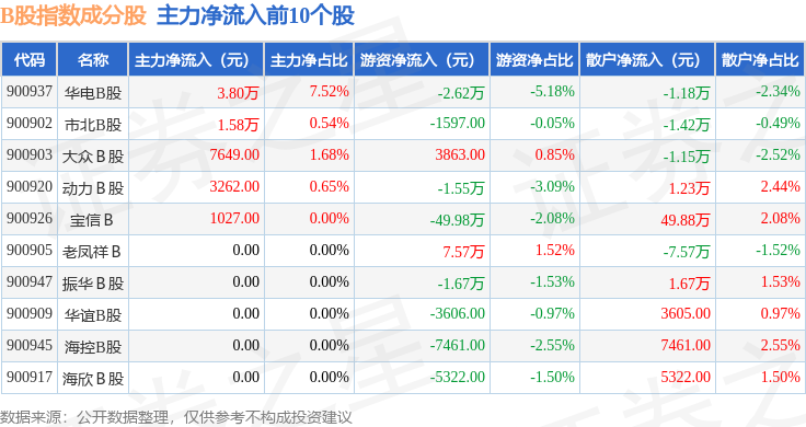 资金流向方面,B股指数(000003)成份股当日主力资金净流出合计23.52万元,游资资金净流出合计93.97万元,散户资金净流入合计117.5万元。成份股资金流向详情见下表: