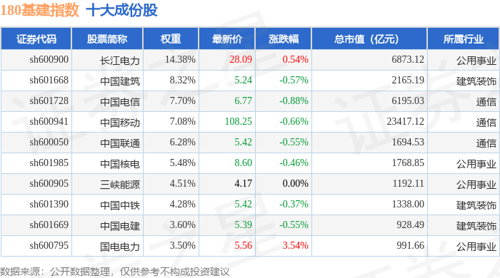 证券之星消息,11月27日,180基建(000025)指数报收于1801.56点,涨0.1%,成交125.09亿元,换手率0.32%。当日该指数成份股中,上涨的有15家,国电电力以3.54%的涨幅领涨,下跌的有14家,中国电信以0.88%的跌幅领跌。
