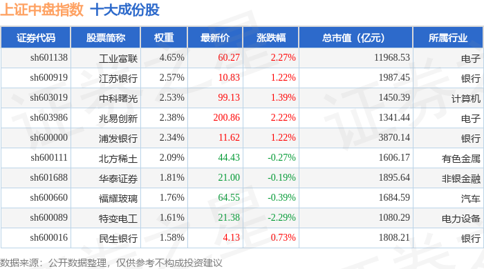 证券之星消息,11月27日,上证中盘(000044)指数报收于4462.09点,涨0.35%,成交1070.68亿元,换手率0.56%。当日该指数成份股中,上涨的有55家,恒立液压以10.0%的涨幅领涨,下跌的有60家,万泰生物以2.89%的跌幅领跌。