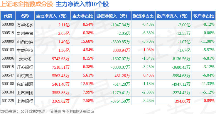 资金流向方面,上证地企(000055)指数成份股当日主力资金净流入合计3.33亿元,游资资金净流入合计5054.0万元,散户资金净流出合计3.84亿元。成份股资金流向详情见下表: